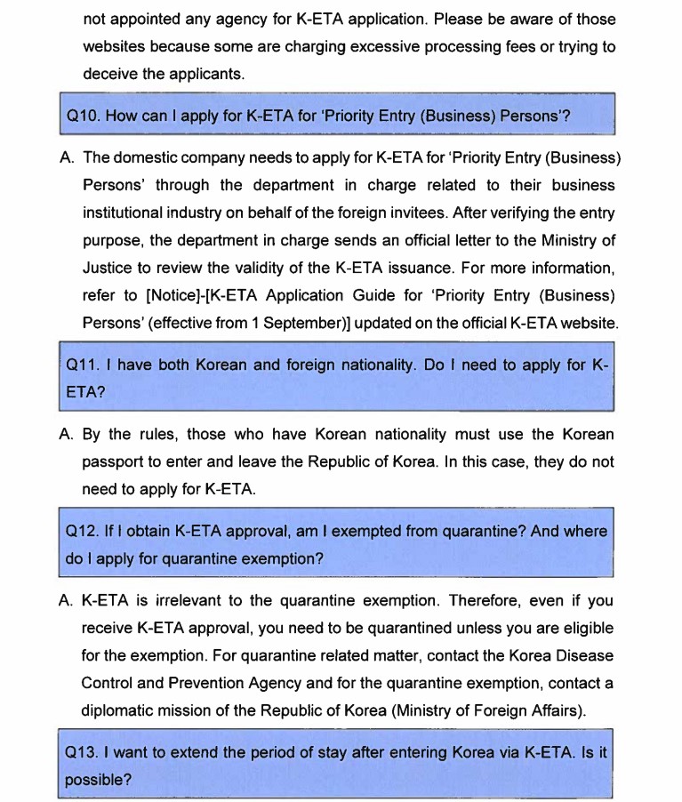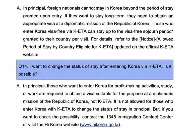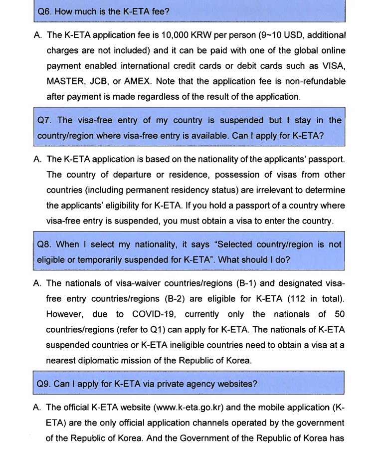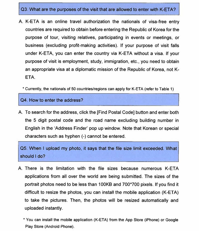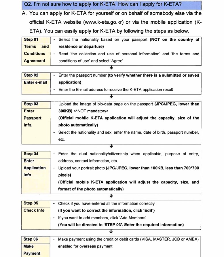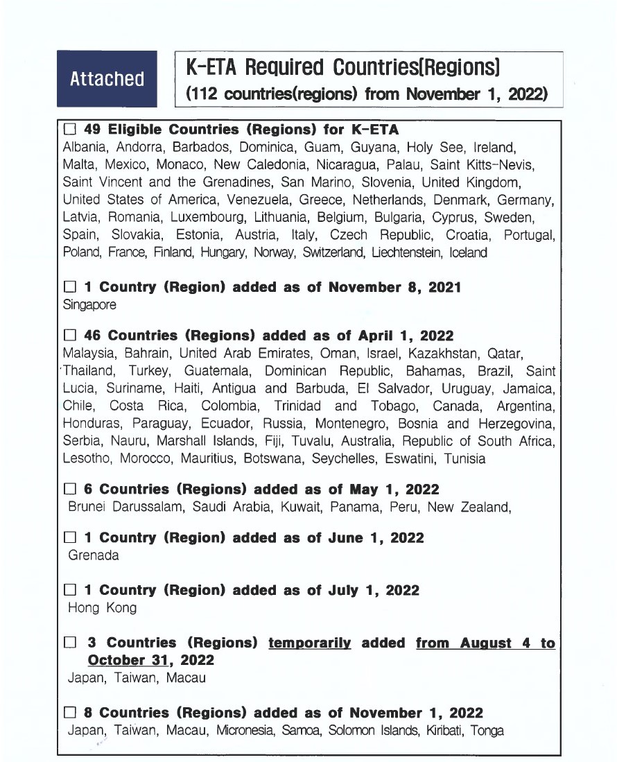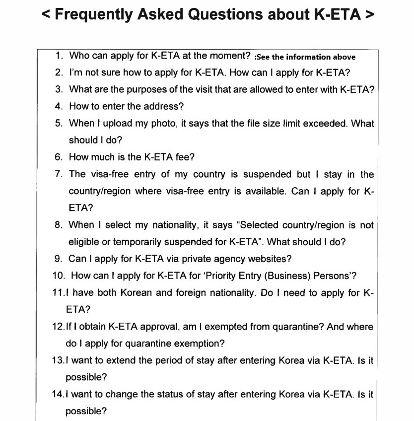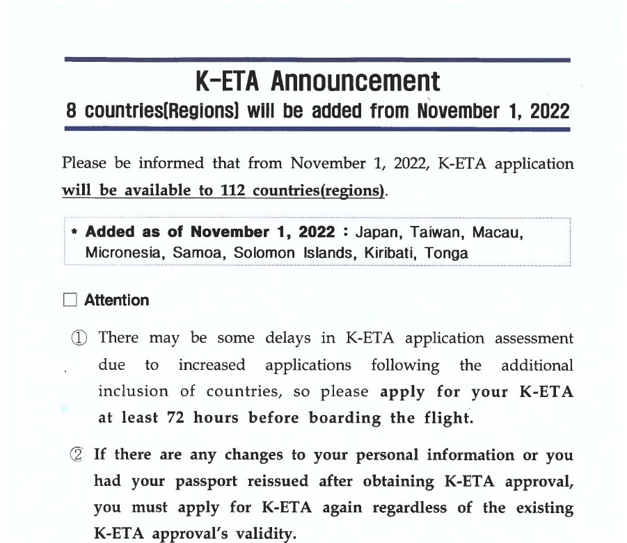 Cependant, tous les étrangers pouvant voyager en Corée sans visa doivent préalablement obtenir l'autorisation numérique sur le système ''K-ETA'' qui sera également lancée au même jour : https://www.k-eta.go.kr/portal/apply/index.do?locale=EN