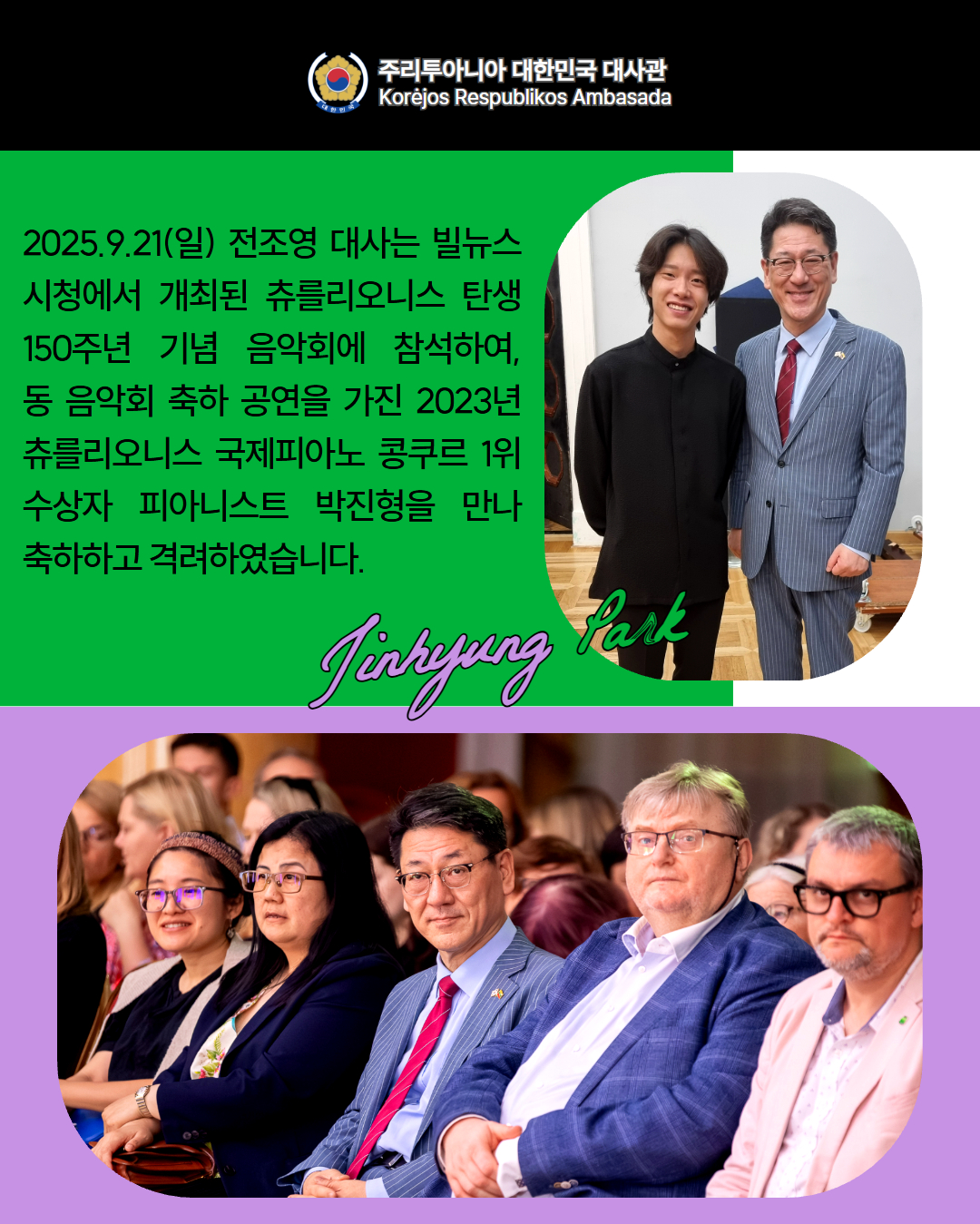 전조영 대사, 츄를리오니스 탄생 150주년 기념 음악회 참석 및 연주자 박진형 피아니스트 격려(2025.09.21)